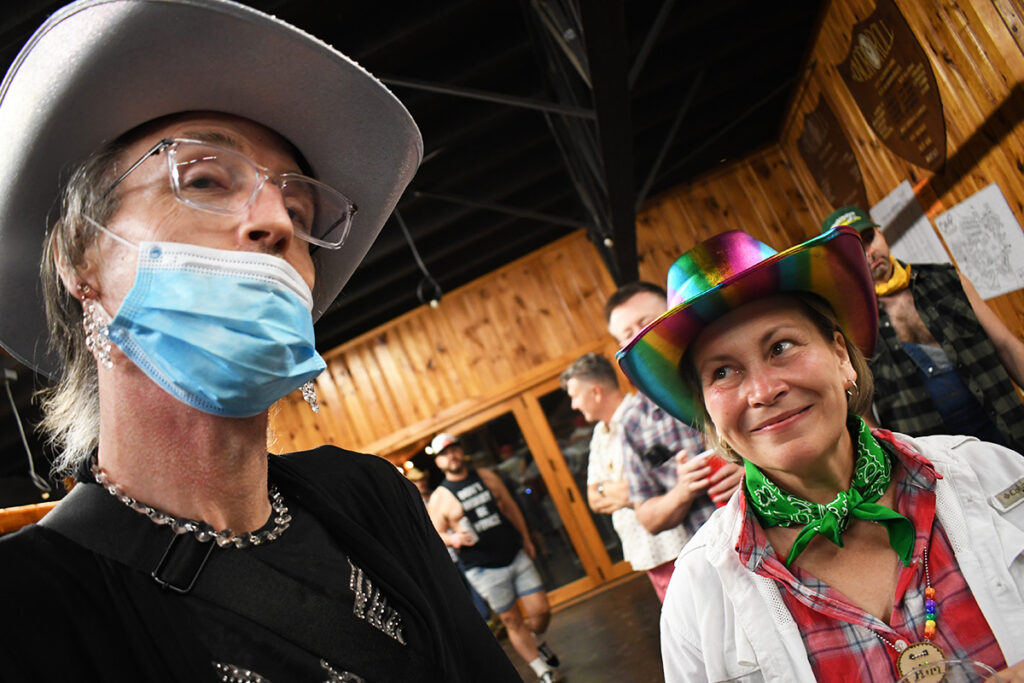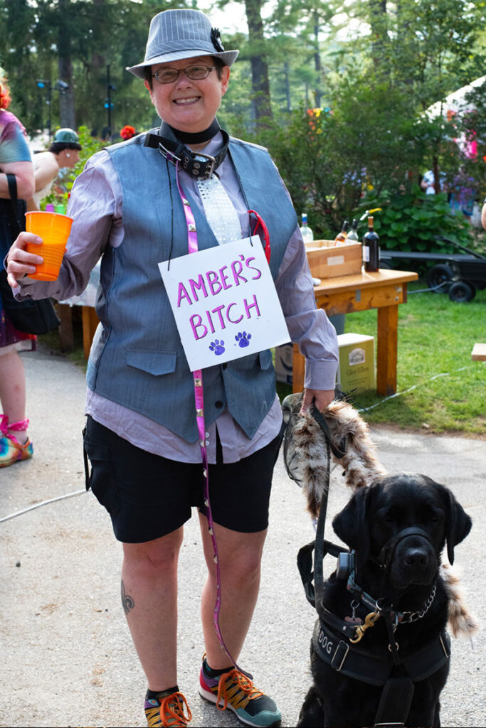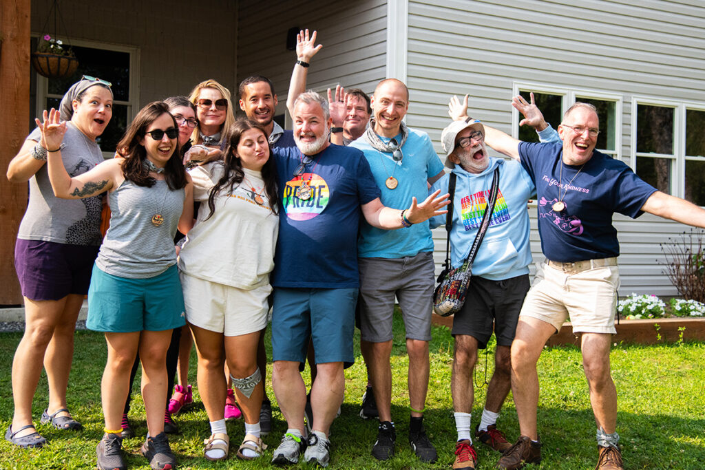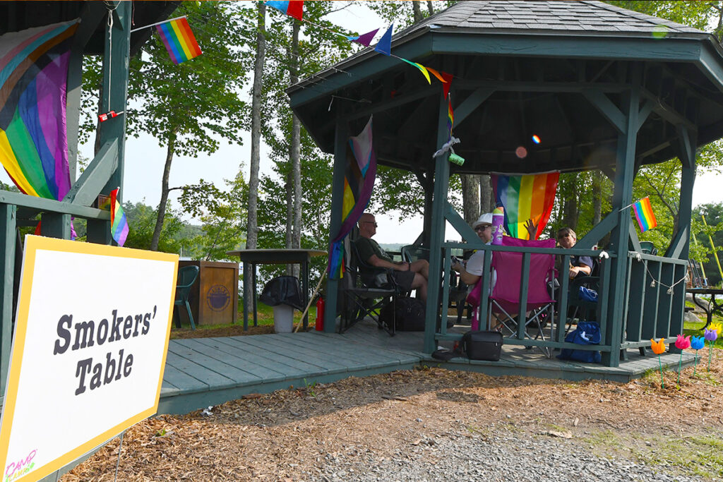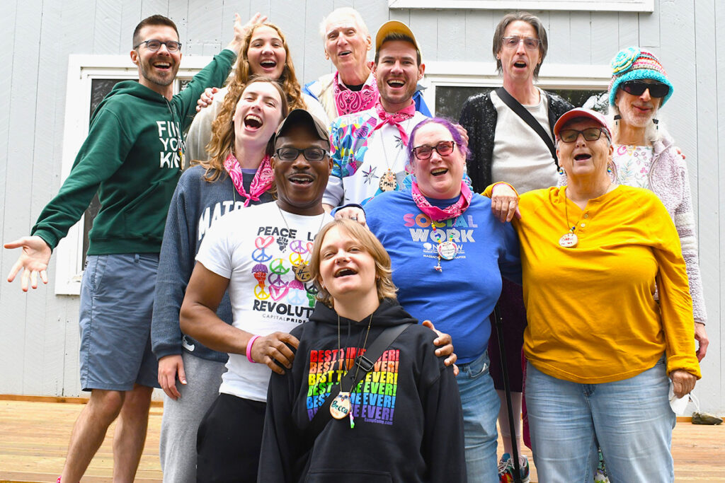 Camp is usually attended by 200-250 people, and all gender-identities are welcome. (In recent years, about 55% of Campers identify as male, 40% as female, and 5% or so as non-binary/genderqueer — our swiftest growing demographic.) Most summers see upwards of 30 states in the U.S. represented by our attendees, and we usually have a few folks from Canada in attendance as well. In recent years, we have also hosted folks from around the globe, including the U.K., Germany, Mexico, and Australia. About 80% of our Campers are single (or are attending without their spouses/partners), and they range in age from 21 to their 70s, with most in their early- to mid-40s. (In 2024, our Campers actually ranged in age from 21 to 83!) …And yes, we always have a few people who identify as heterosexual at Camp, too. Queer allies are always welcome to join us, as long as they’re comfortable bunking in a cabin with a bunch of LGBTQ+ folks.